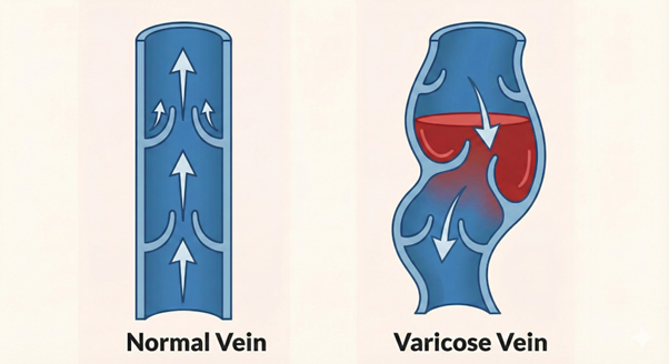 下肢静脈瘤とは、足の静脈にある血液の逆流を防ぐ「弁」が壊れ、汚れた血液が足に溜まってしまう病気です。