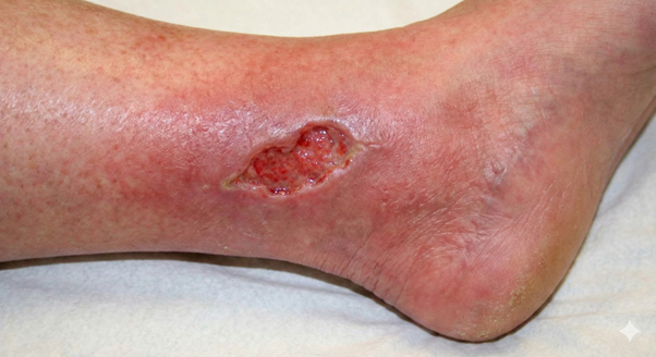 足首周辺の皮膚が茶褐色に変色し、硬く板のようになってしまいます。さらに悪化すると、皮膚がえぐれる「潰瘍(かいよう)」ができたり、溜まった血液が固まって「血栓性静脈炎」を起こし、激しい痛みや腫れを伴うこともあります[1]。