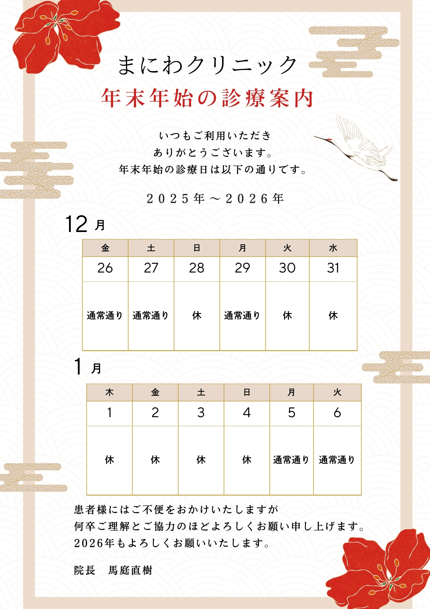 まにわクリニックでは通常診療は12月29日(月)までとなっております。年明けは1月5日(月)から通常診療をいたします。